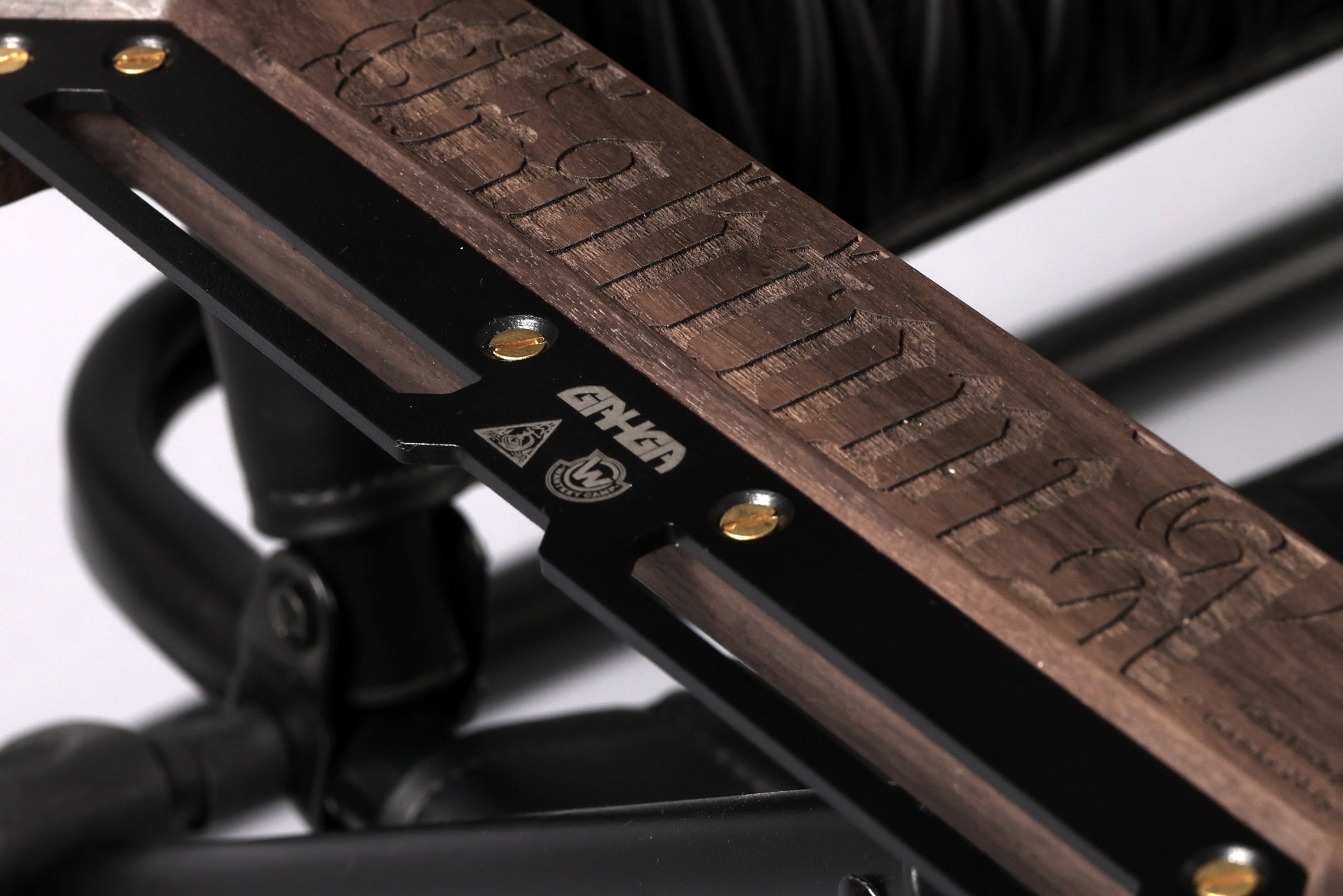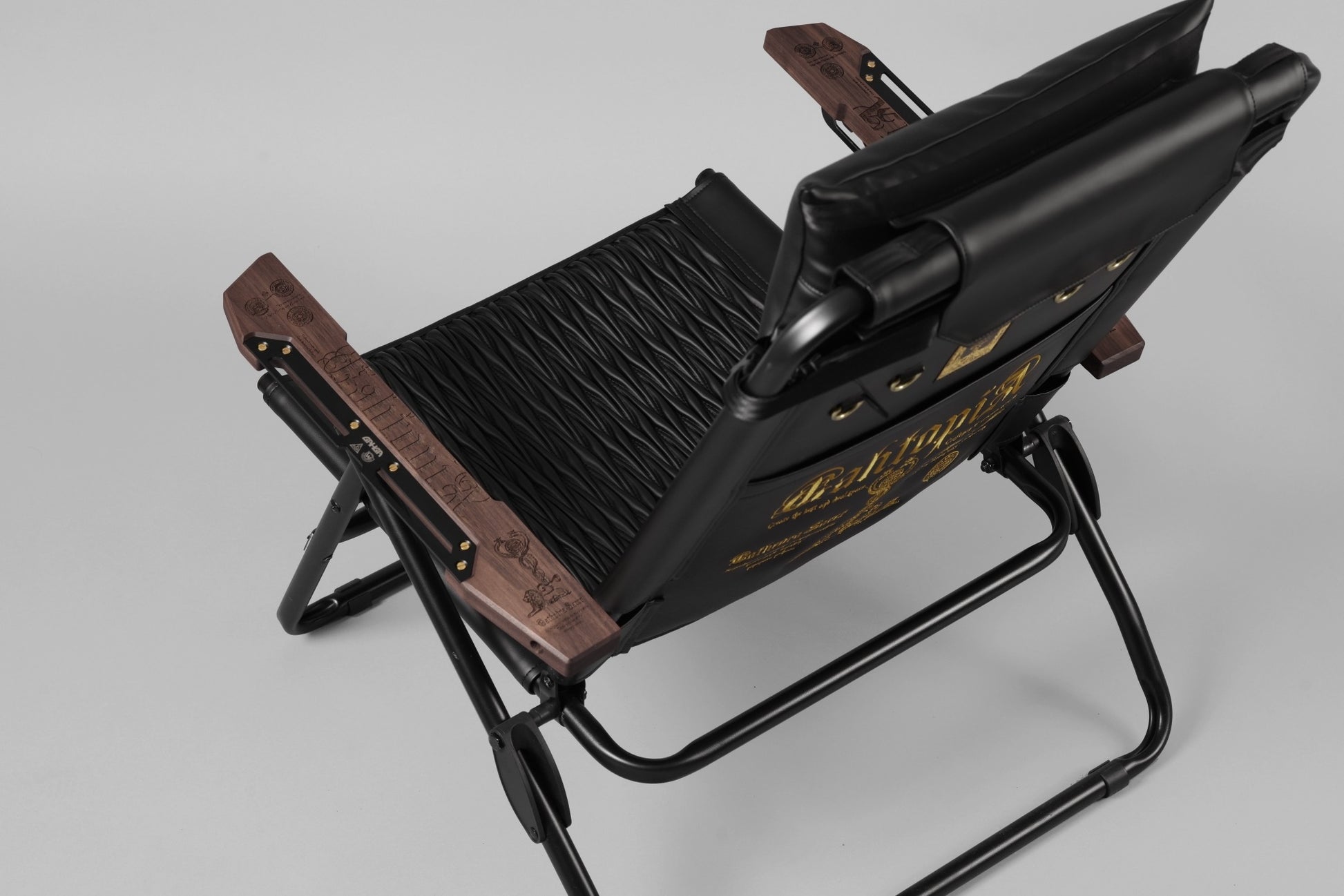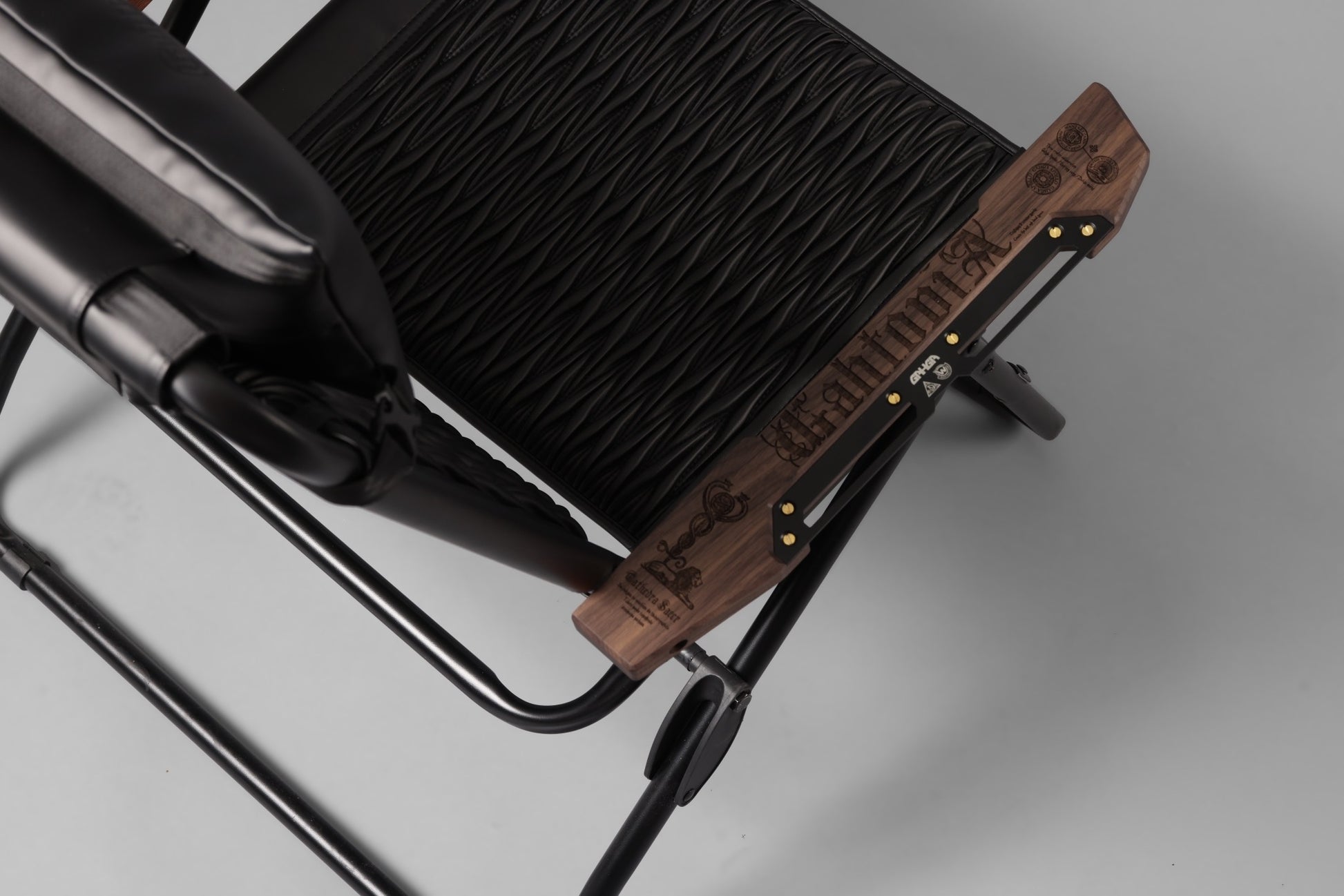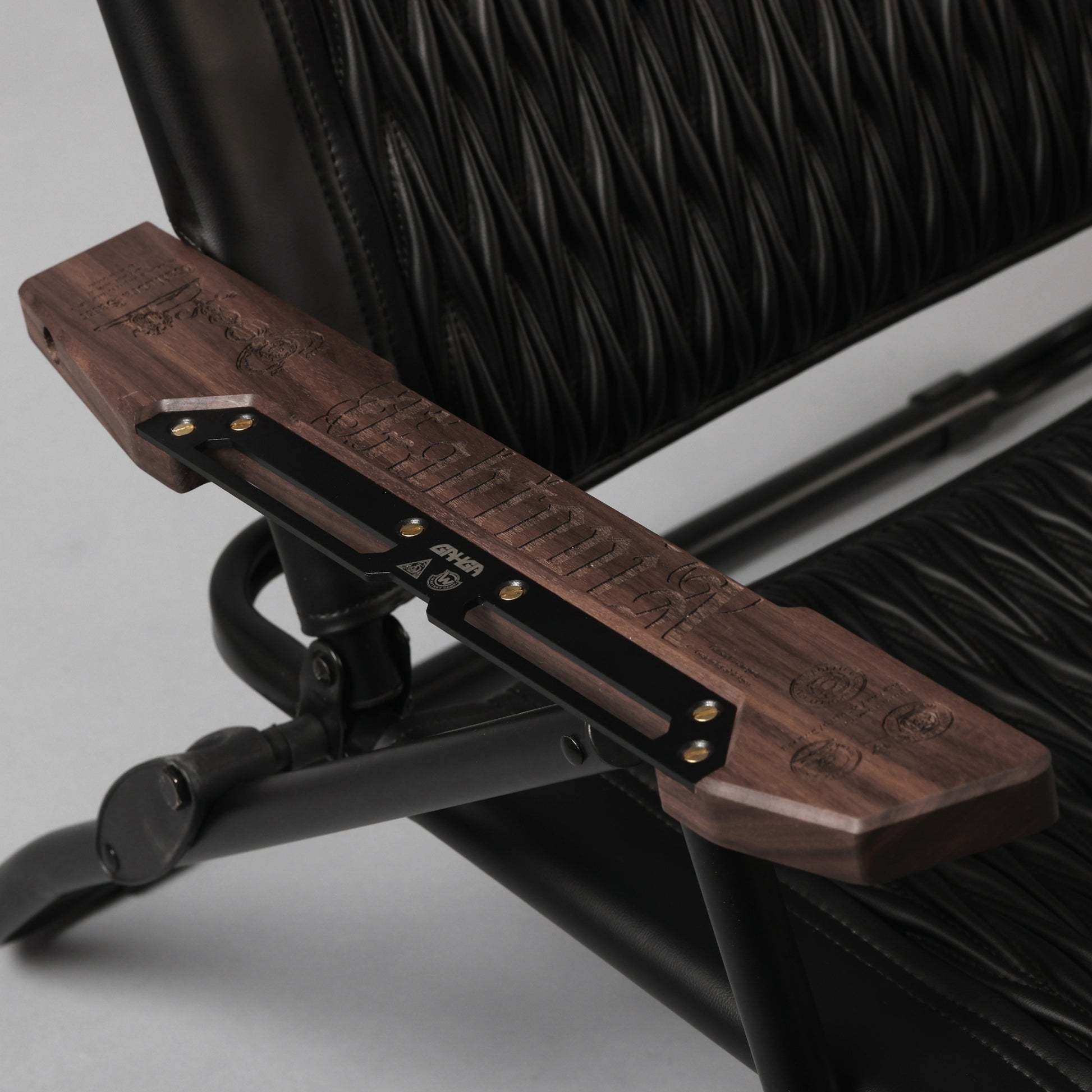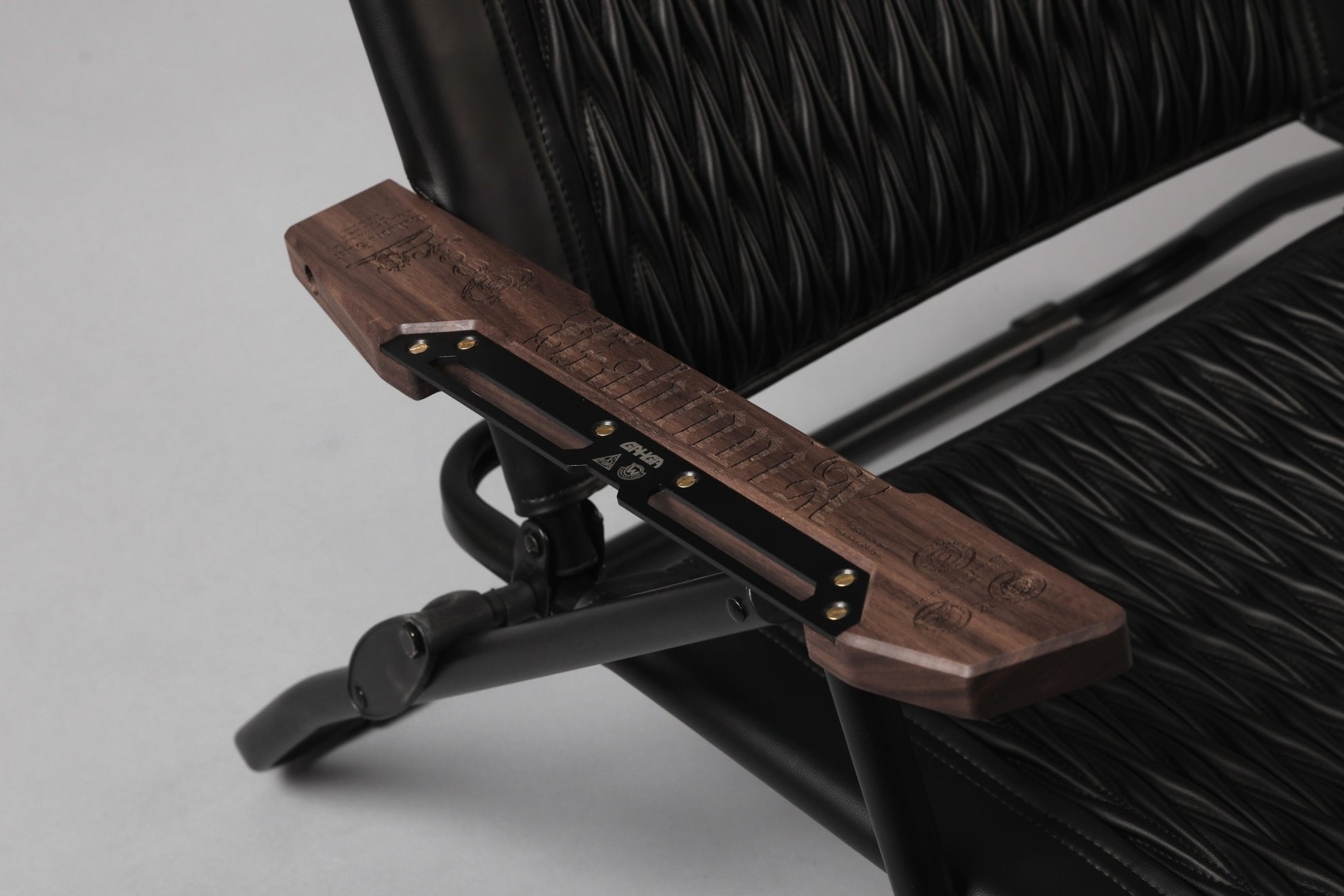 肘掛けにはWANTKEY CAMPらしさ全開の作りで、木材はウォールナットを使用し、ネジには真鍮を使用。